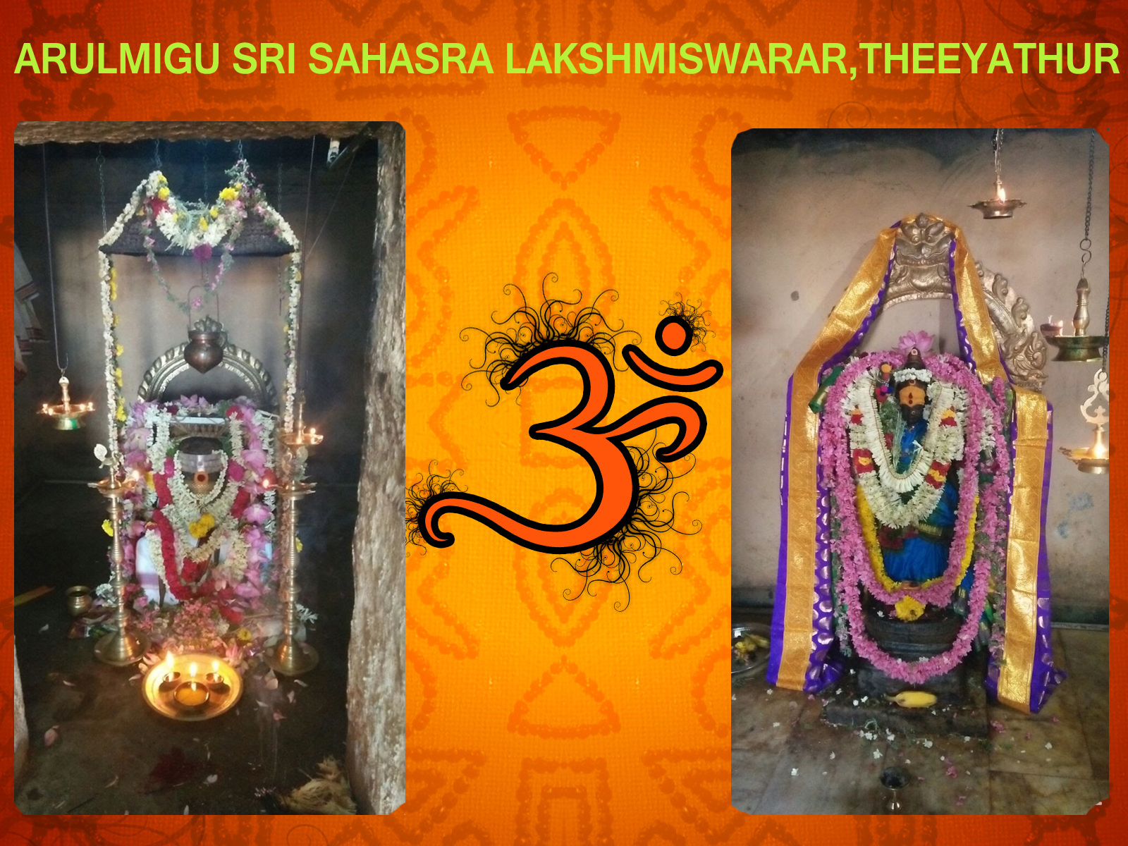 Sri Brahannayaki Sametha Sahasra Lakshmeeshwarar temple is one of the old Shiva temples that was built some 2000 yrs ago and is located in a place called Theeyathur in Pudukottai Dist. This temple is located near the famous Aavudaiyar temple. The main god of this temple is Lord Shiva and He is a Suyambu Moorthy and he graces His devotees facing East. The Goddess is known as Brahannayaki and She graces facing South.